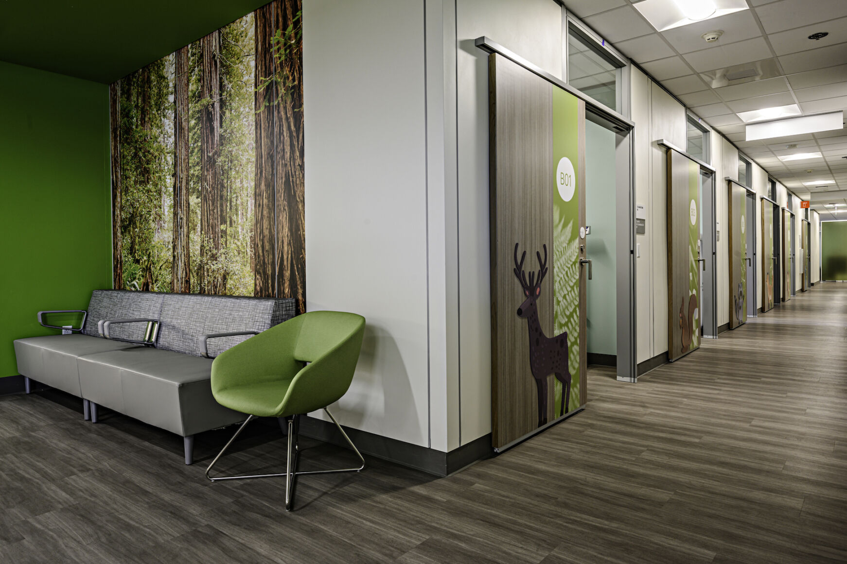 Tenant Improvement of the first and second floor of an existing three-story medical office building. The project will provide clinic space for women’s health, pediatrics, family practice, specialists, and dental. A modular partition system is used for most of the project in combination with a vacuum based plumbing system. 3 parking spaces removed for emergency generator to be provided. This one-stop health care home features two color-coded pods with open, centralized staff bull pens, promoting direct face-to-face communication among the staff and allowing patients to see their provider team at work. An expandable conference room provides ample space for group care, educational sessions, and support group. Unique features include Modular Walls that allow the rooms too move quickly and fit to any desired specific needs. All possible because of an overhead Vacuum Waste System designed by AcornVac that include quick disconnects and isolation valves allowing any wall to be moved in a matter of minutes.