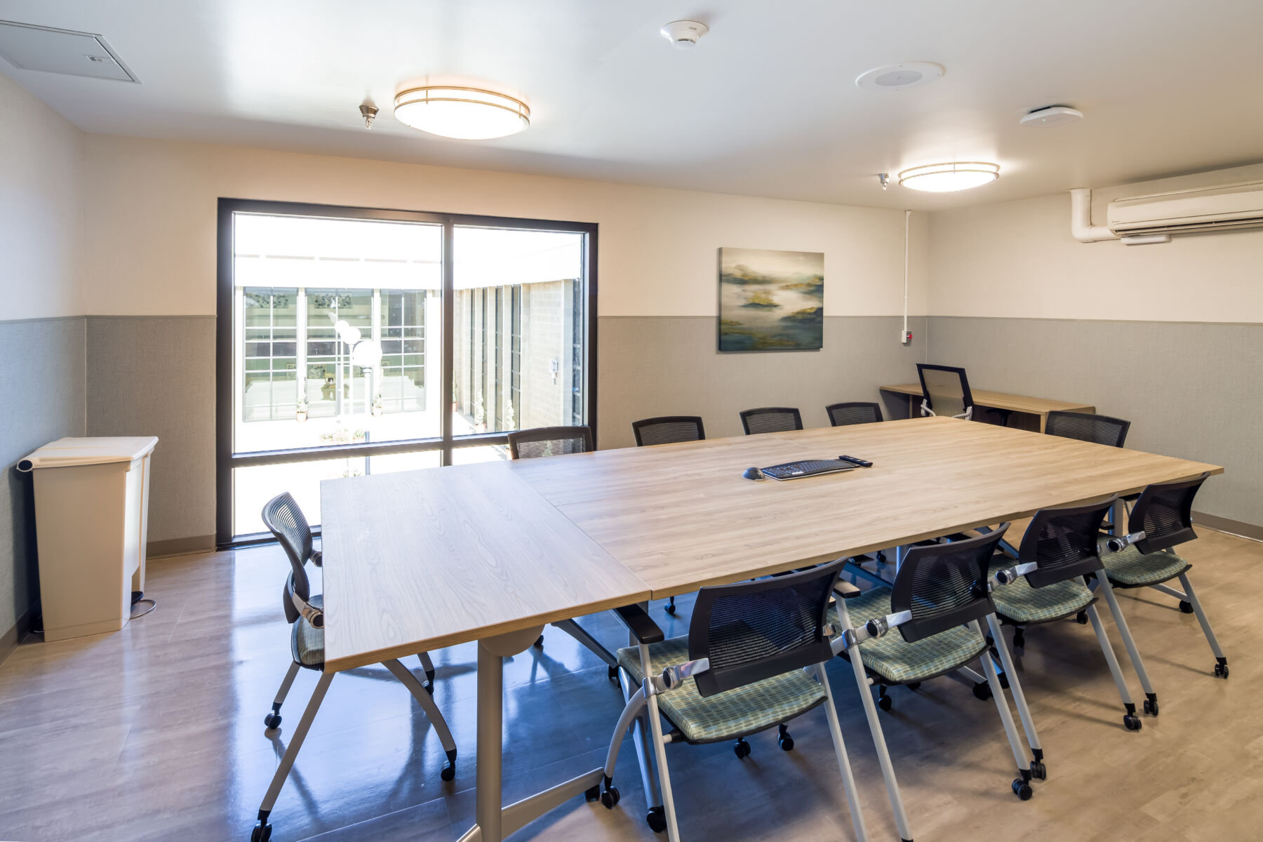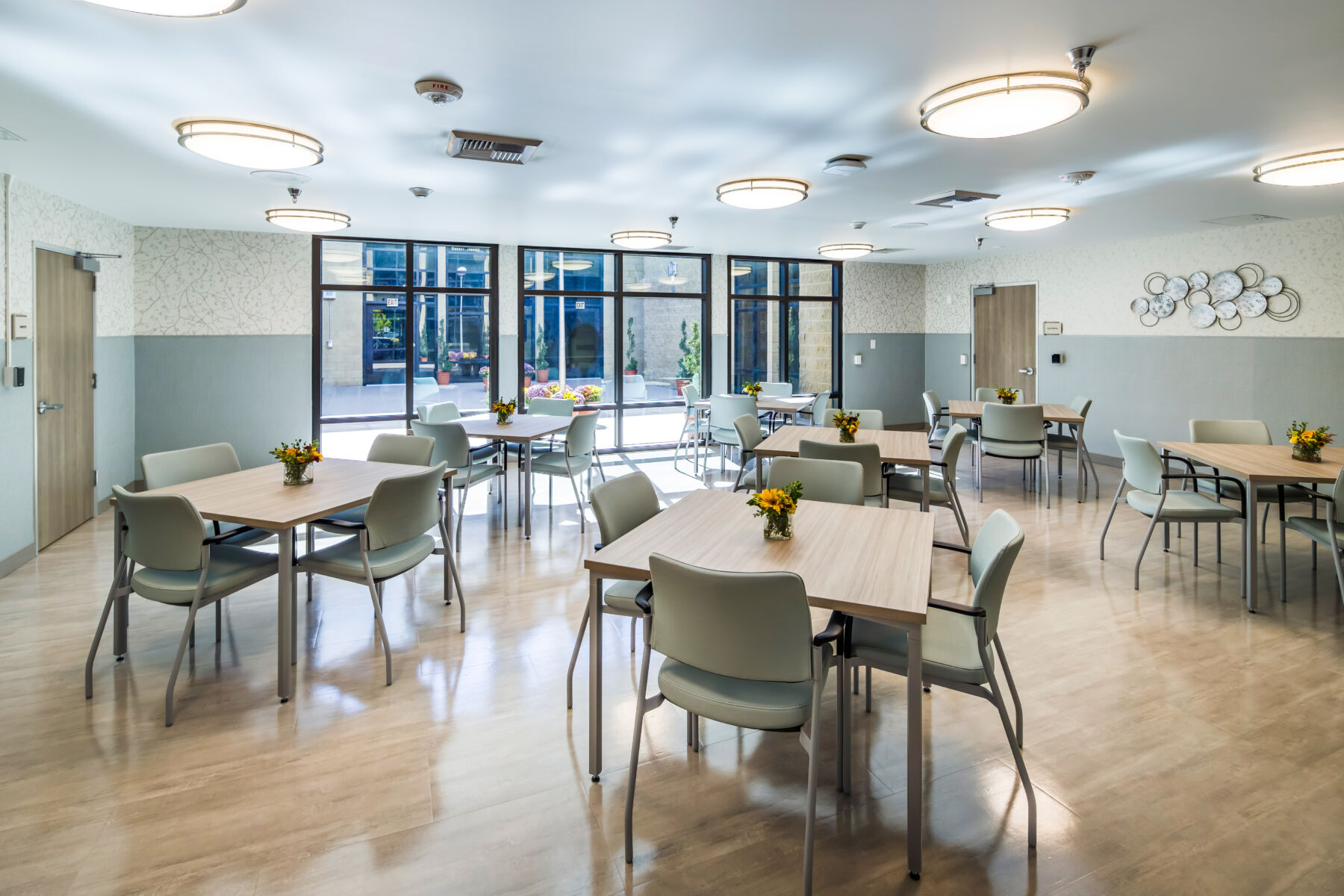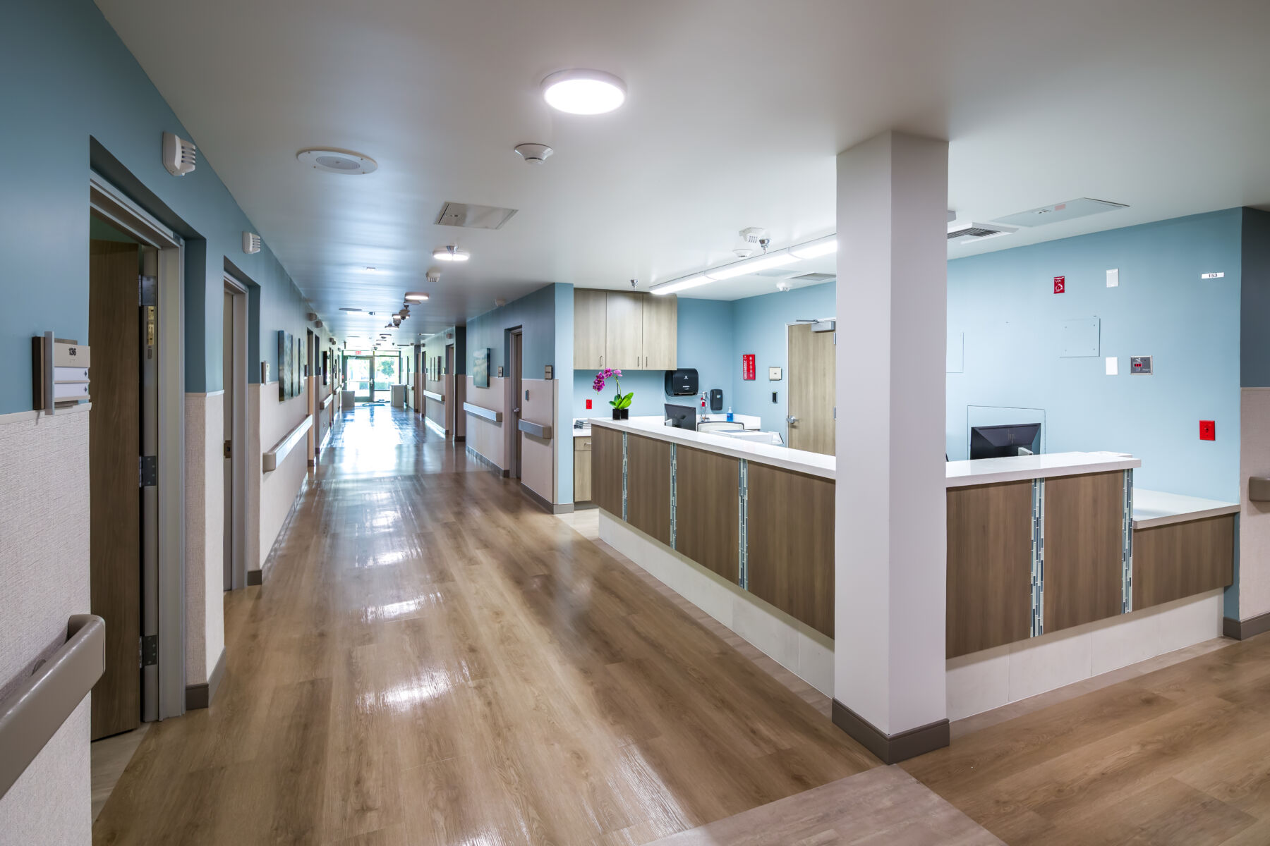 Selective demolition and refurbishment of an existing two-story skilled nursing facility. This facility serves 154 beds in a mix of one- and two-bed patient rooms, supported by four nurse stations, a lobby and admissions suite, business offices, staff lounge, utility rooms, and a full-service kitchen. Resident amenities include dining rooms, multipurpose rooms, a beauty shop, and two enclosed courtyards. Clinical areas provide occupational and physical therapy, showers, and visiting spaces.
