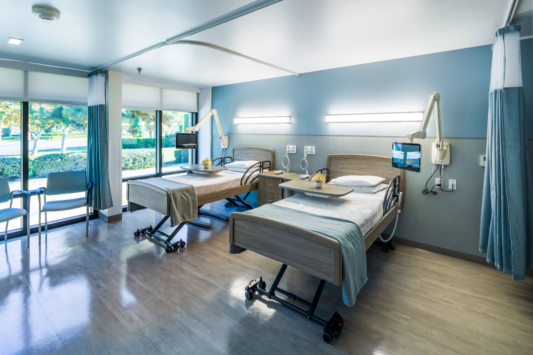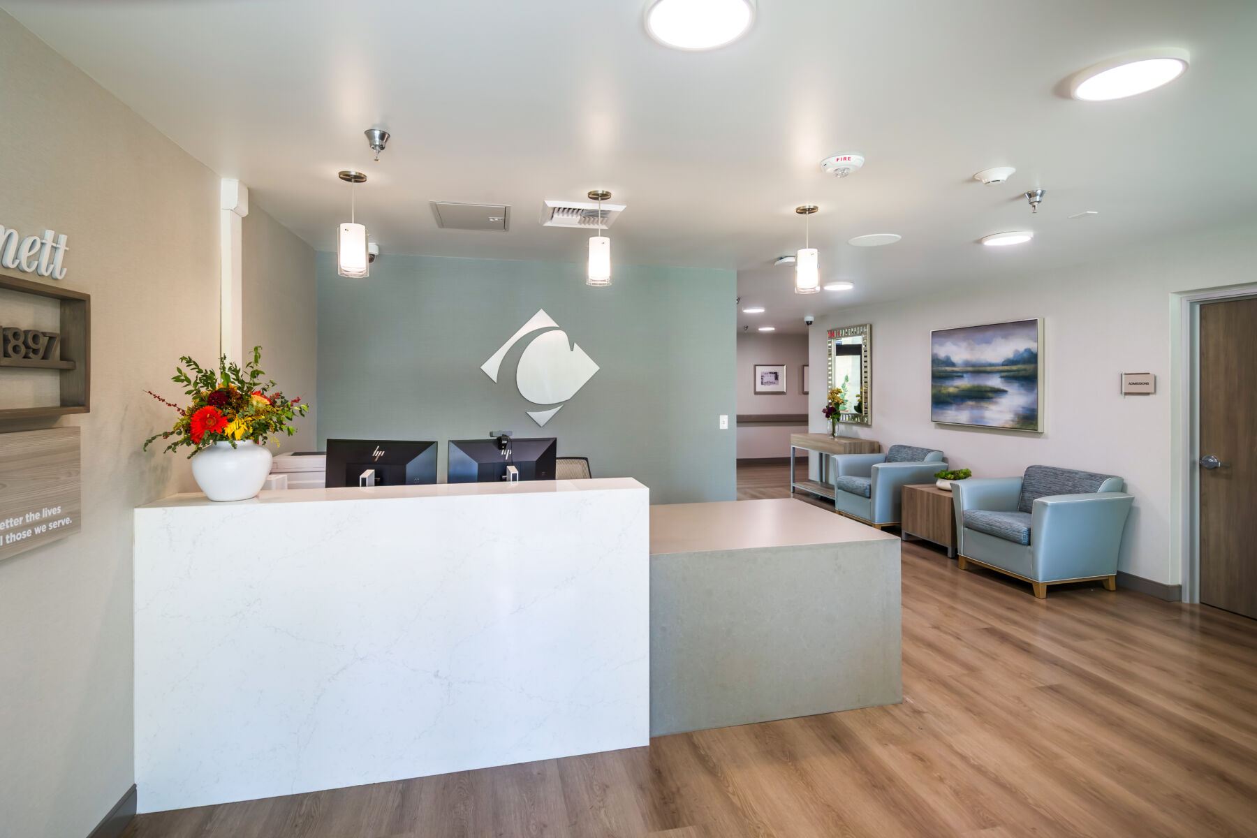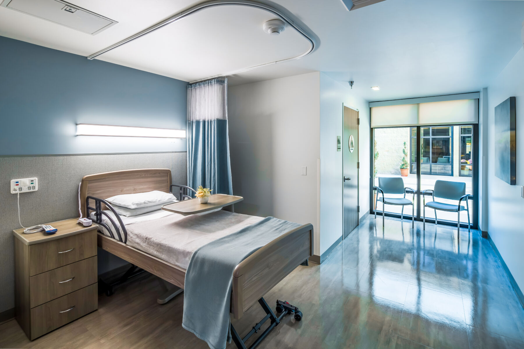 Selective demolition and refurbishment of an existing two-story skilled nursing facility. This facility serves 154 beds in a mix of one- and two-bed patient rooms, supported by four nurse stations, a lobby and admissions suite, business offices, staff lounge, utility rooms, and a full-service kitchen. Resident amenities include dining rooms, multipurpose rooms, a beauty shop, and two enclosed courtyards. Clinical areas provide occupational and physical therapy, showers, and visiting spaces.