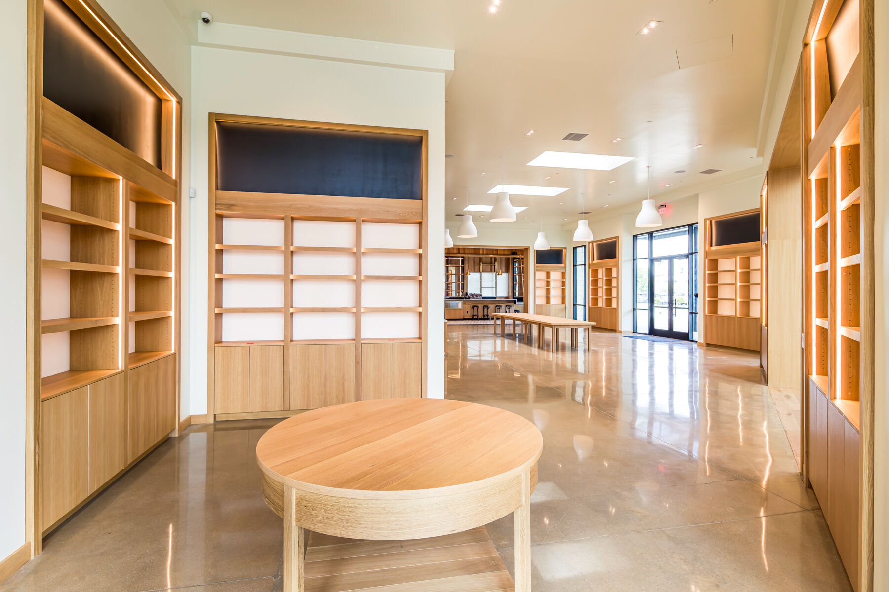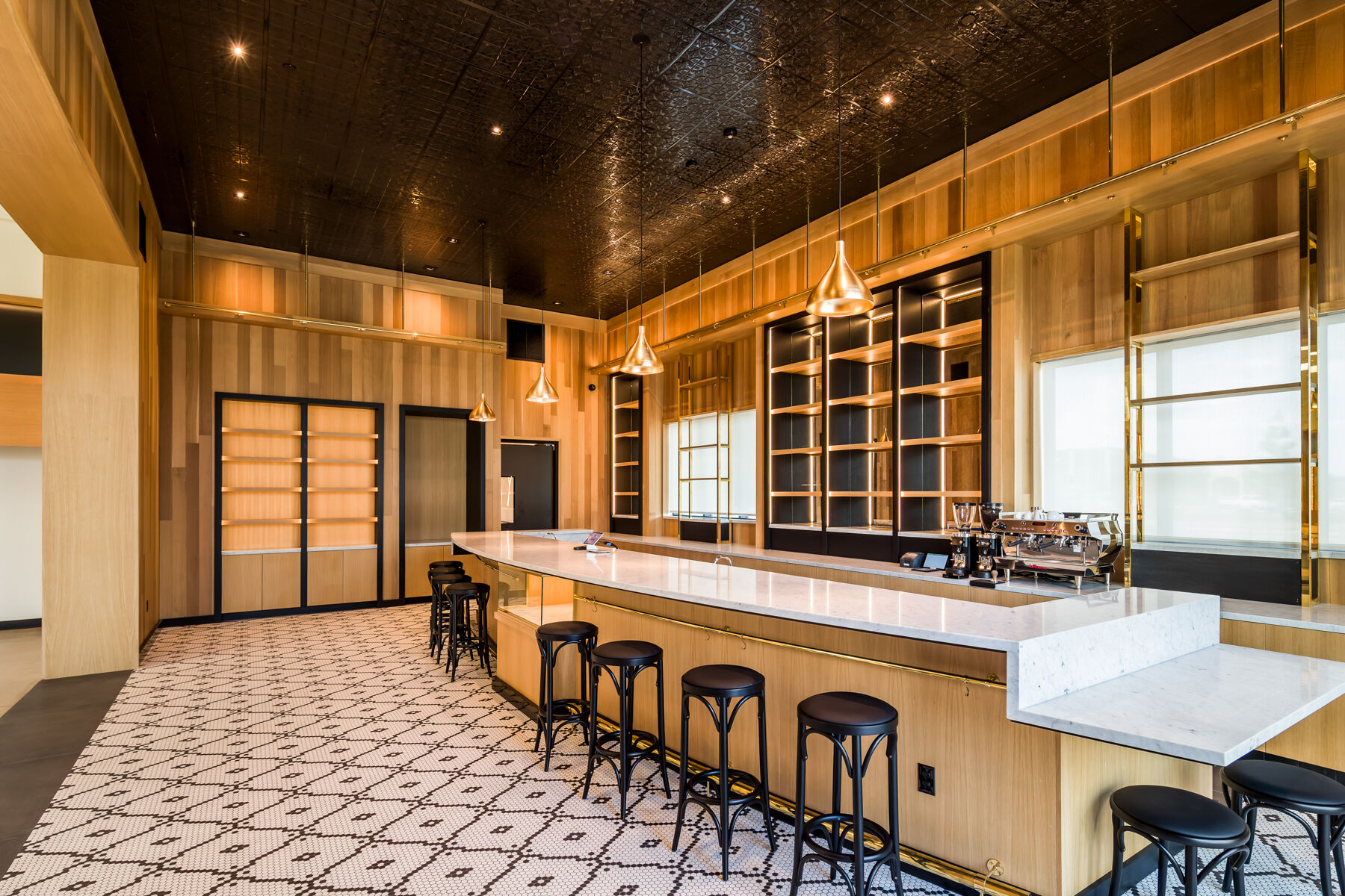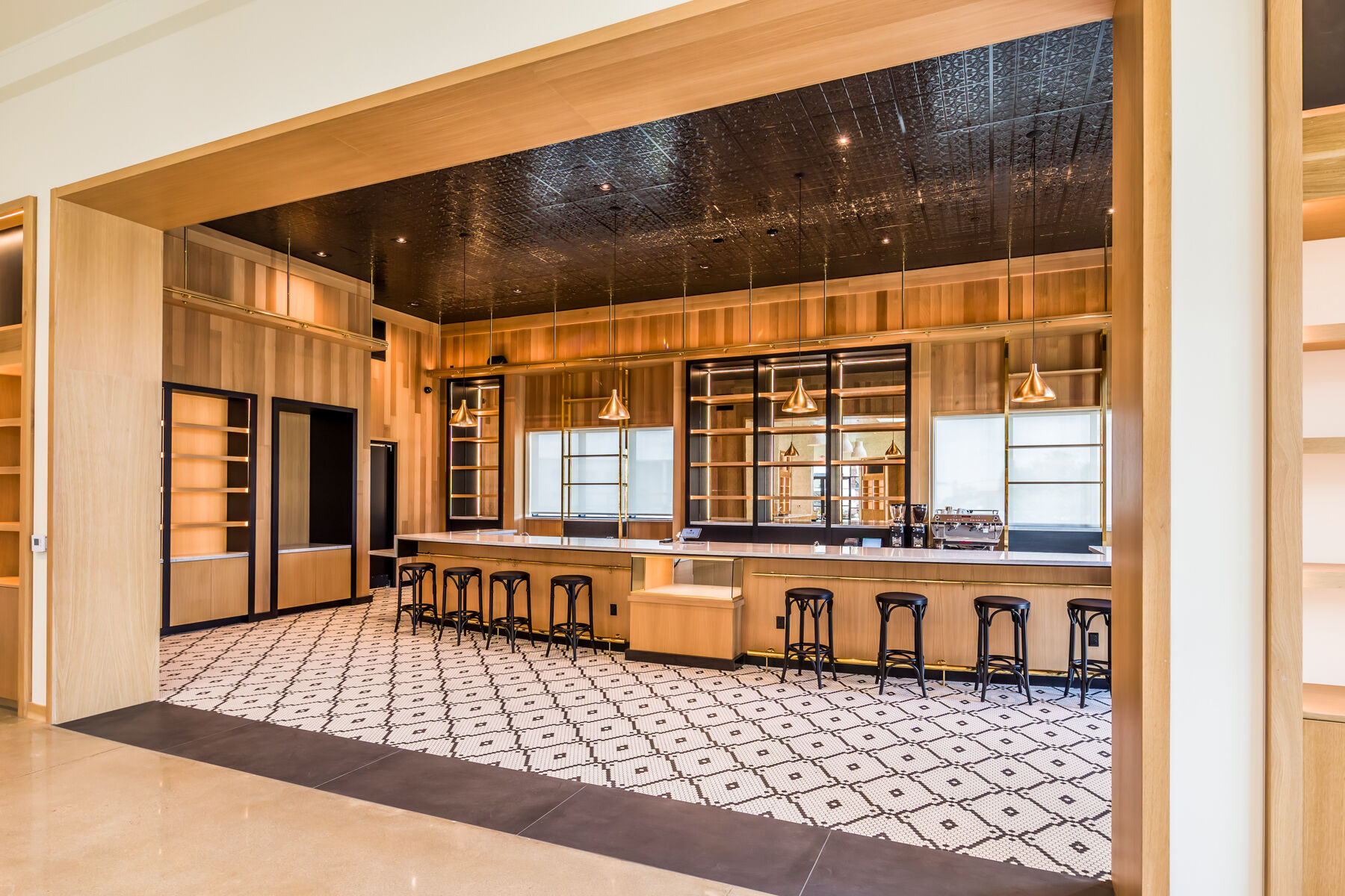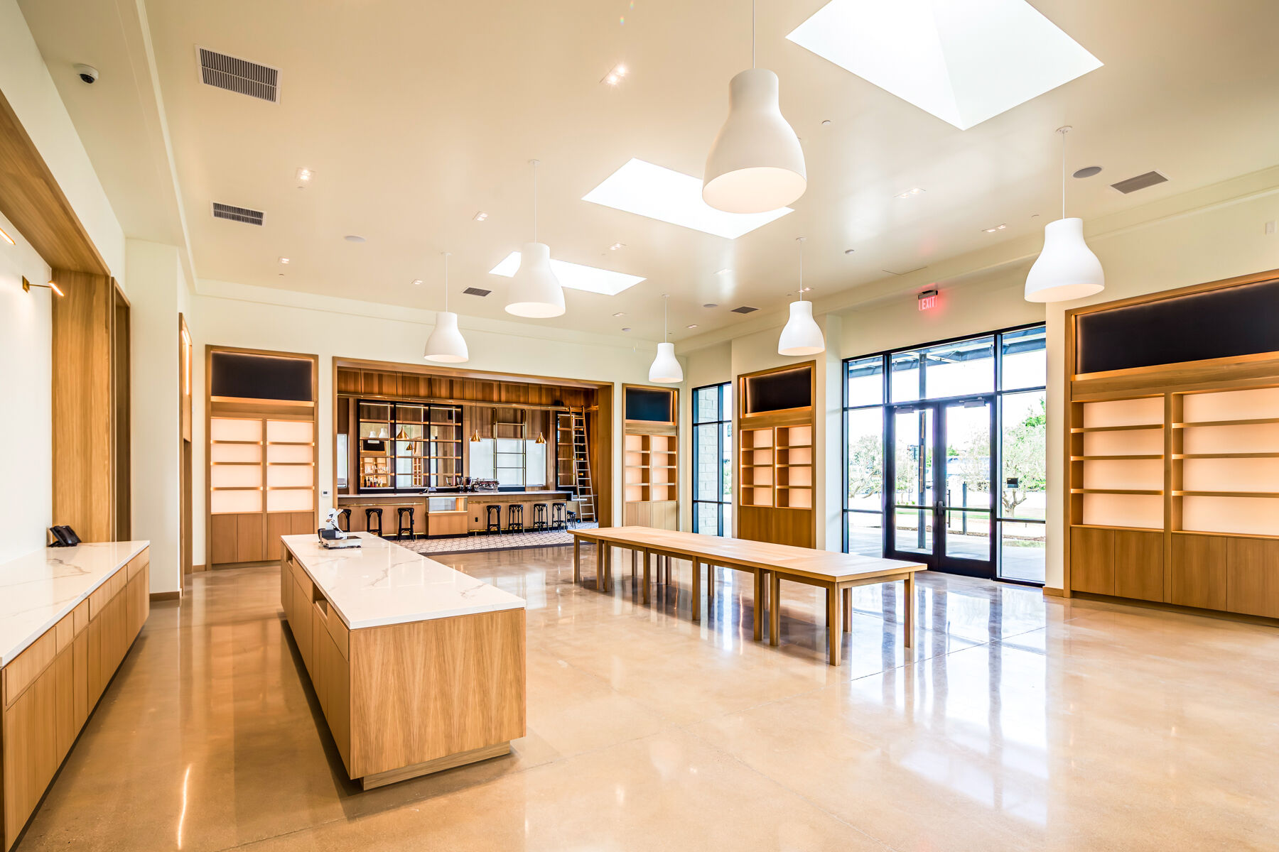 Enzo's Table is a retail space in a detached single-story building, part of a new commercial development also constructed by Quiring. This tenant improvement project has a mercantile shopping area, a café with a bar, and support spaces that include an office and kitchen area.