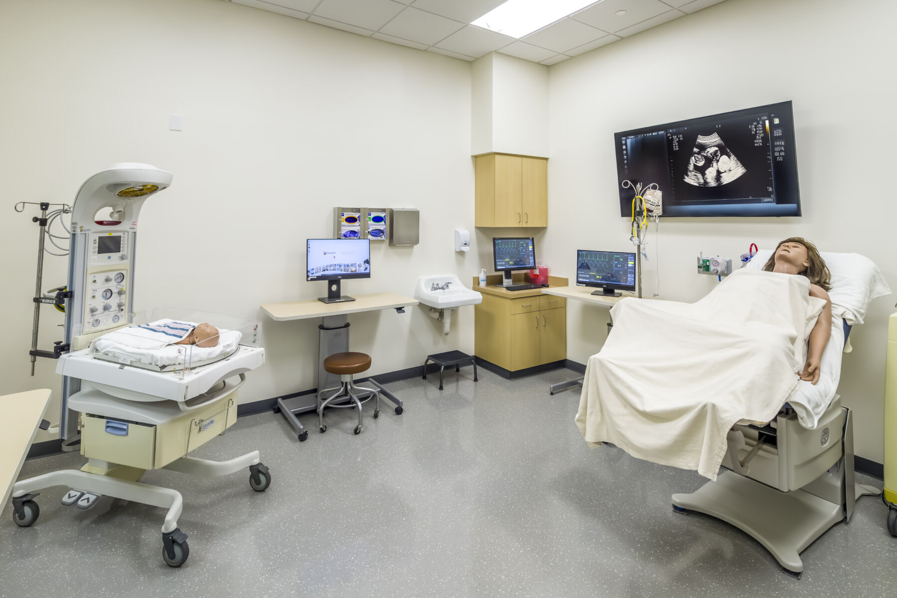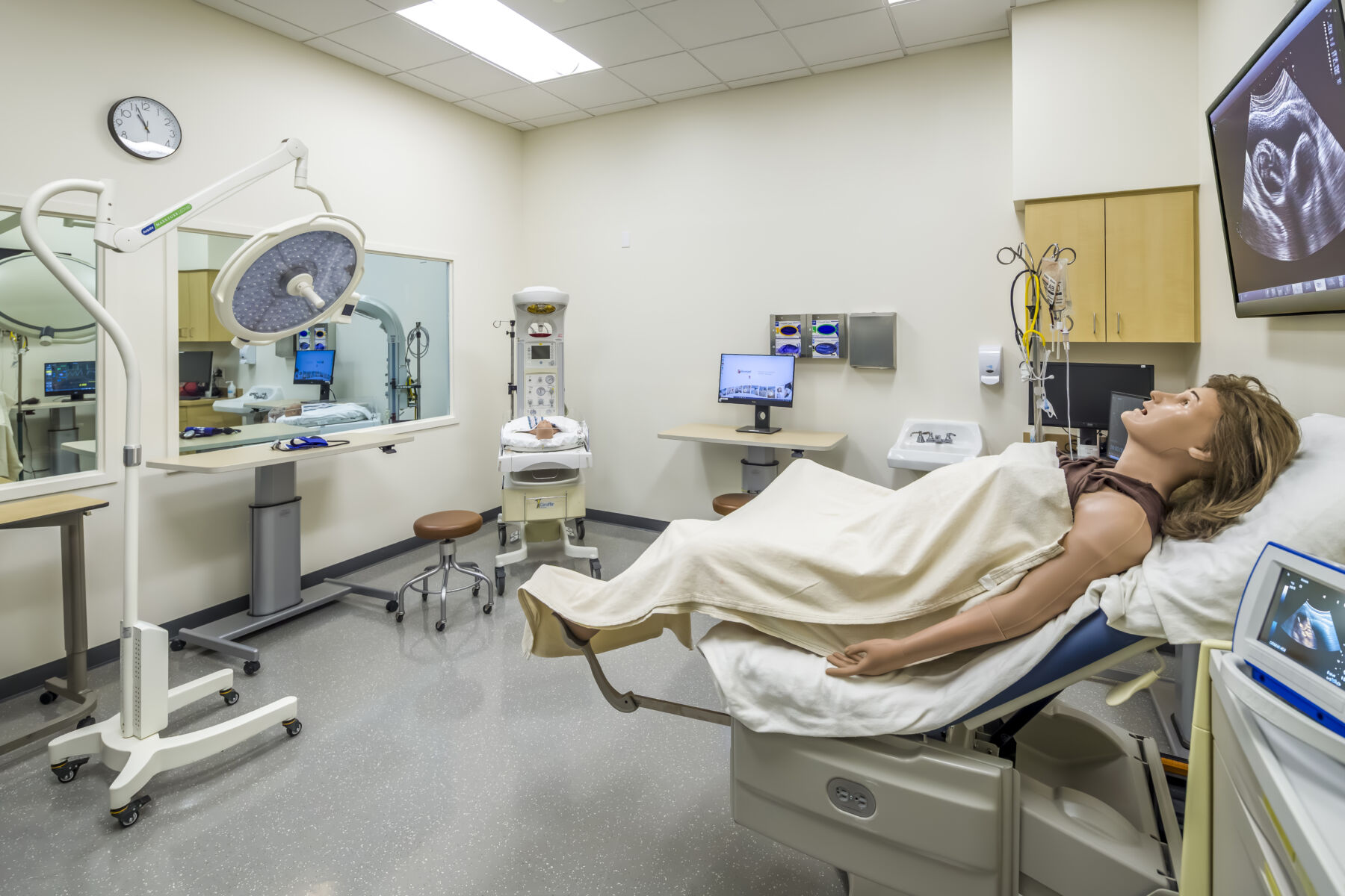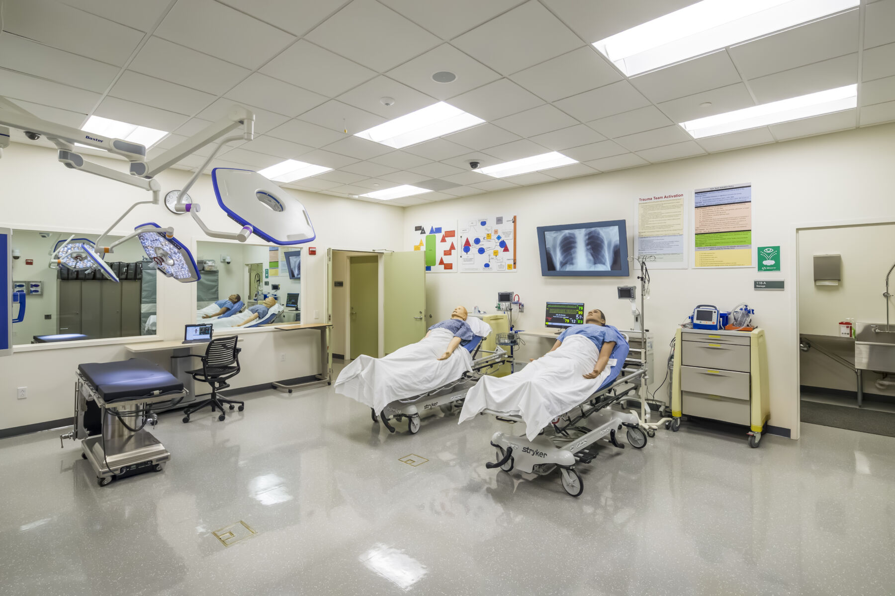The UCSF Fresno Simulation Laboratory tenant improvement converts an existing lab space into a 2,500-square-foot advanced clinical training facility. The project delivers new exam rooms, high-fidelity simulation suites, and a central control room/observation gallery designed to replicate real patient care environments for over 300 residents and students annually. Support spaces include equipment storage and gurney-width corridors that connect training units, ensuring seamless movement of equipment and personnel throughout the facility.